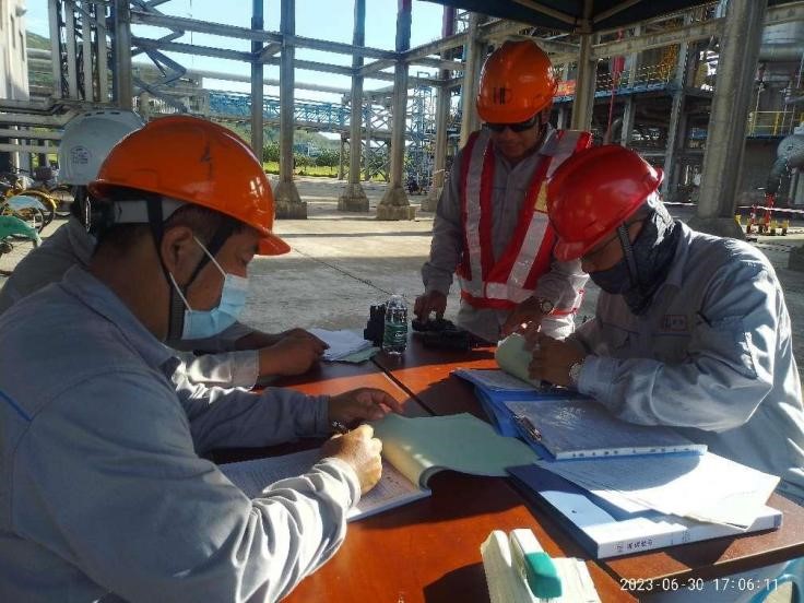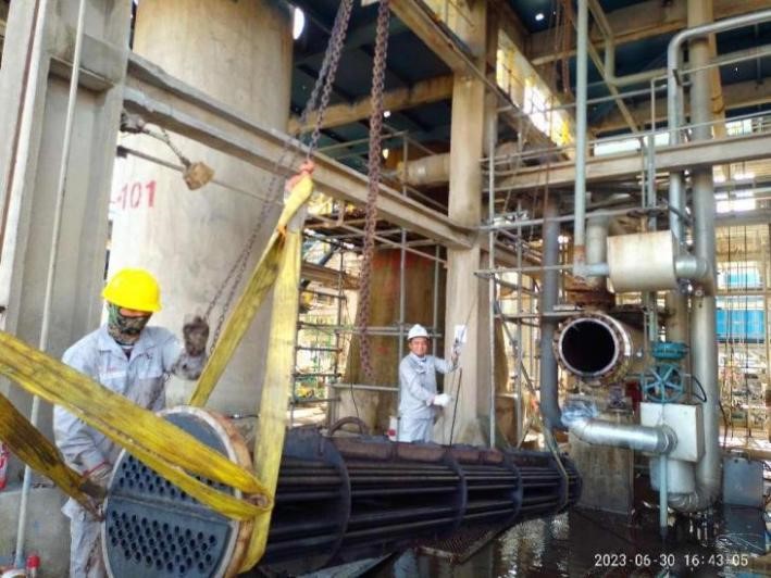 設(shè)備工程部專工武良對換熱器E-205抽芯作業(yè)進(jìn)行檢查指導(dǎo)。