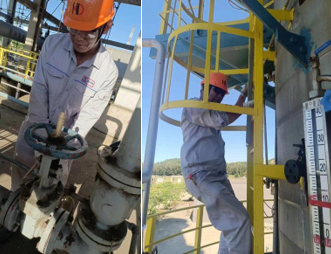 張曉東在塔頂對安全閥除銹、打磨作業(yè)進(jìn)行監(jiān)護(hù),正己烷車間主任黃維山對管線補(bǔ)焊情況進(jìn)行檢查。